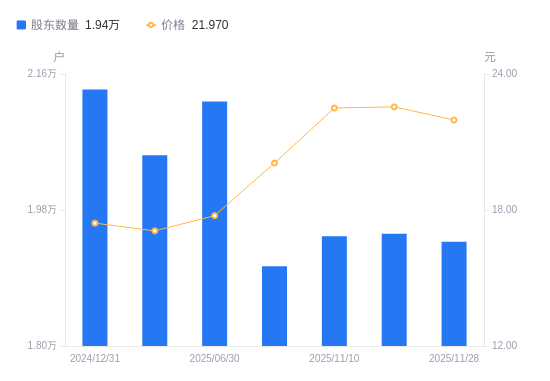 12月5日消息,数据显示,截至2025年11月20日,朗坤科技A股股东总户数为1.95万户,较上期(2025年11月10日)增加35户,增幅0.18%。公司最新A股总股本为2.41亿股,其中流通A股1.24亿股,户均持有流通A股数量为6348.84股,较上期减少11.42股,降幅0.18%;户均持流通A股市值14.32万元,较上期增加60.4元,增幅0.04%。