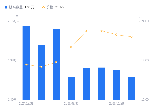 近一年(2024年12月31日至2025年12月10日),朗坤科技A股股东户数从2.14万户,减低至1.91万户,降幅10.88%,区间股价上涨21.77%。