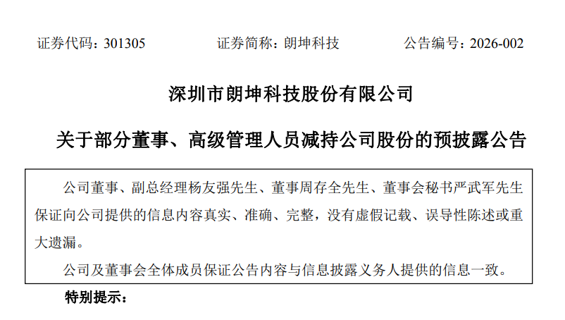 2月5日,朗坤科技(301305.SZ)公告,公司董事、副总经理杨友强先生、董事周存全先生、董事会秘书严武军先生拟减持公司股份,拟减持股份数量合计不超173.83万股。