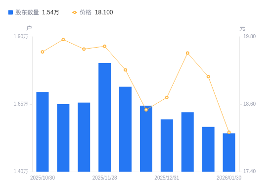 近一年(2025年2月10日至2026年1月30日),昆船智能A股股东户数从1.66万户,减低至1.54万户,降幅7.23%,区间股价下跌0.75%。