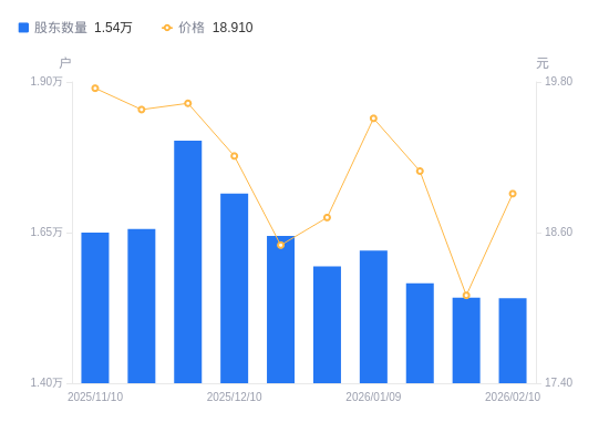 近一年(2025年2月10日至2026年2月10日),昆船智能A股股东户数从1.66万户,减低至1.54万户,降幅7.29%,区间股价上涨3.70%。