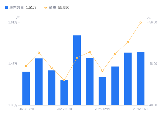 近一年(2025年1月20日至2026年1月20日),智立方A股股东户数从1.13万户,增加至1.51万户,增幅33.16%,区间股价上涨84.79%。