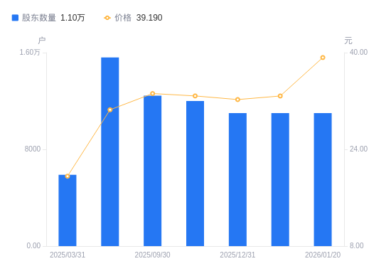 近一年(2025年3月31日至2026年1月20日),鑫磊股份A股股东户数从5893户,增加至1.1万户,增幅86.66%,区间股价上涨104.35%。