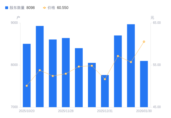 近一年(2025年1月20日至2026年1月20日),趣睡科技A股股东户数从4302户,增加至8968户,增幅108.46%,区间股价下跌2.05%。