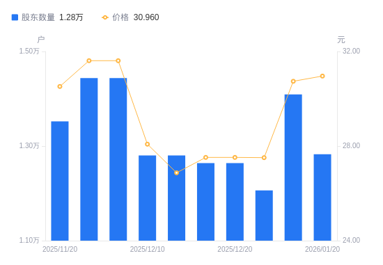 近一年(2025年1月20日至2026年1月20日),亚华电子A股股东户数从1.44万户,减低至1.28万户,降幅10.80%,区间股价上涨10.69%。