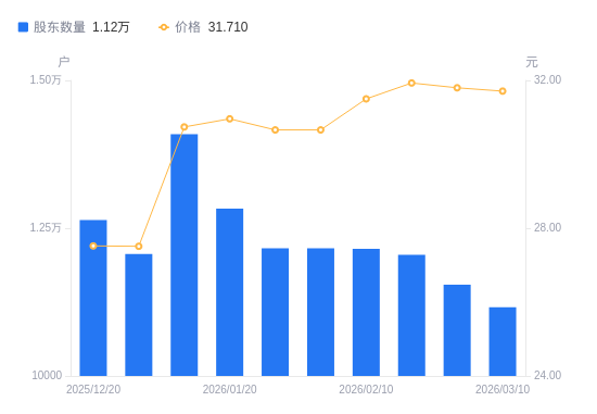 3月13日消息,数据显示,截至2026年3月10日,亚华电子A股股东总户数为1.12万户,较上期(2026年2月27日)减少382户,降幅3.31%。公司最新A股总股本为1.04亿股,其中流通A股4429.01万股,户均持有流通A股数量为3967.22股,较上期增加131.26股,增幅3.42%;户均持流通A股市值12.58万元,较上期增加3816.88元,增幅3.13%。