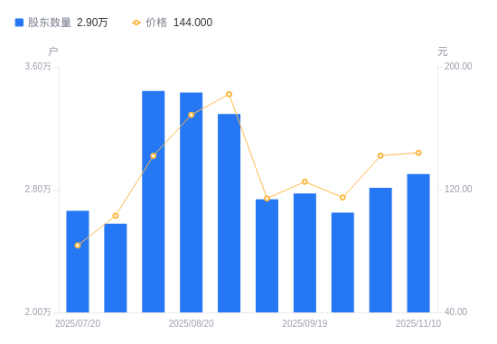近一年(2024年11月20日至2025年11月10日),北方长龙A股股东户数从1.23万户,增加至2.9万户,增幅136.14%,区间股价上涨299.78%。