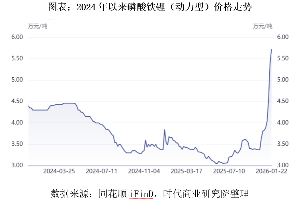 同花顺(300033)iFinD数据显示,磷酸铁锂(动力型)价格从2025年年初的3.55万元/吨下探至2025年年中的3.05万元/吨,随后触底反弹,2025年11月以来价格开始飙升,截至2026年1月22日涨至5.73万元/吨,较2025年低位上涨87.9%。
