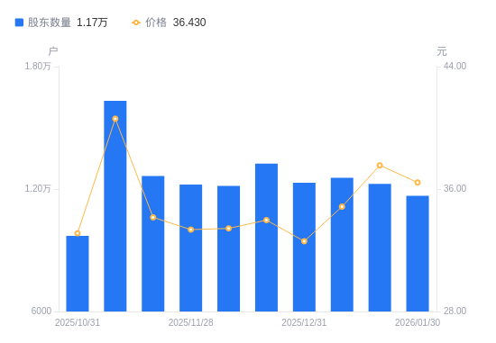 近一年(2025年2月10日至2026年1月30日),众智科技A股股东户数从1.12万户,增加至1.17万户,增幅4.36%,区间股价上涨23.02%。