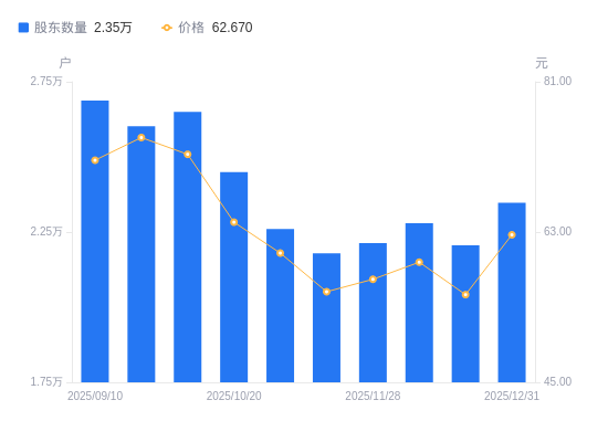 1月29日消息,数据显示,截至2026年1月9日,丰立智能A股股东总户数为2.36万户,较上期(2025年12月31日)增加91户,增幅0.39%。公司最新A股总股本为1.2亿股,其中流通A股6412.14万股,户均持有流通A股数量为2720.93股,较上期减少10.55股,降幅0.39%;户均持流通A股市值18.99万元,较上期增加1.87万元,增幅10.95%。