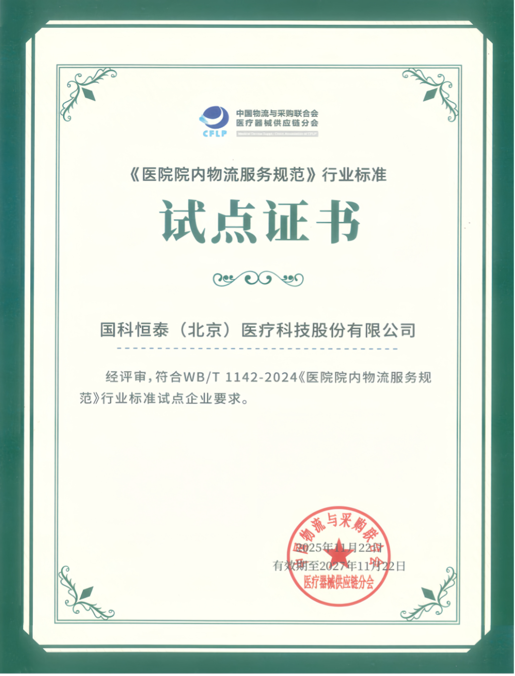 首批试点资质不仅是企业供应链服务能力的证明,更标志着国科恒泰从“服务提供者”到“规则制定者”的蜕变。未来,国科恒泰将继续践行"用心服务,合作共赢"的理念,积极参与行业标准建设,为中国医疗器械行业的高质量发展添砖加瓦,为"健康中国"的美好愿景贡献力量。