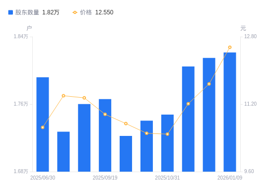 1月20日消息,数据显示,截至2026年1月9日,国科恒泰A股股东总户数为1.82万户,较上期(2025年12月31日)增加65户,增幅0.36%。公司最新A股总股本为4.71亿股,其中流通A股3.24亿股,户均持有流通A股数量为1.78万股,较上期减少63.67股,降幅0.36%;户均持流通A股市值22.31万元,较上期增加1.47万元,增幅7.07%。