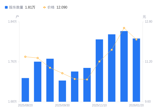 1月21日消息,数据显示,截至2026年1月20日,国科恒泰A股股东总户数为1.81万户,较上期(2026年1月9日)减少149户,降幅0.82%。公司最新A股总股本为4.71亿股,其中流通A股3.24亿股,户均持有流通A股数量为1.79万股,较上期增加146.62股,增幅0.82%;户均持流通A股市值21.67万元,较上期减少6404.16元,降幅2.87%。