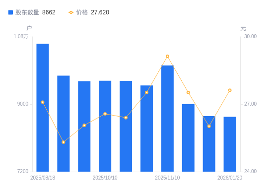 近一年(2025年3月31日至2026年1月20日),科净源A股股东户数从8329户,增加至8662户,增幅4.00%,区间股价上涨38.45%。