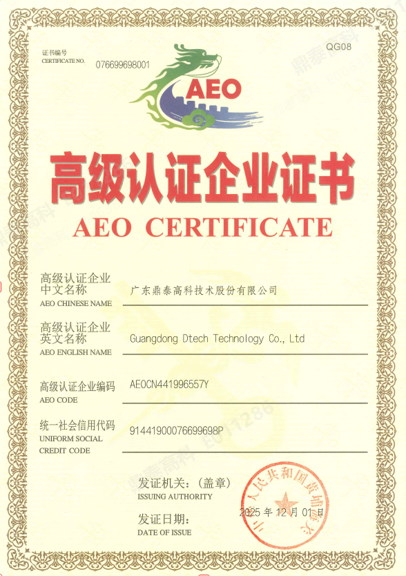 近日,广东鼎泰高科技术股份有限公司成功通过海关AEO高级认证。这一认证不仅是海关对鼎泰高科信用状况、守法水平与安全管理的最高认可,更标志着公司凭借硬核实力拿到了全球贸易的“绿色通行证”。对于积极拓展海外市场的鼎泰高科而言,将有效降低通关成本、缩短物流周期,为企业参与国际竞争注入强劲动力。