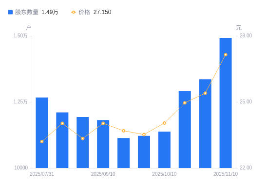 近一年(2024年11月20日至2025年11月10日),未来电器A股股东户数从1.23万户,增加至1.49万户,增幅21.19%,区间股价上涨30.84%。