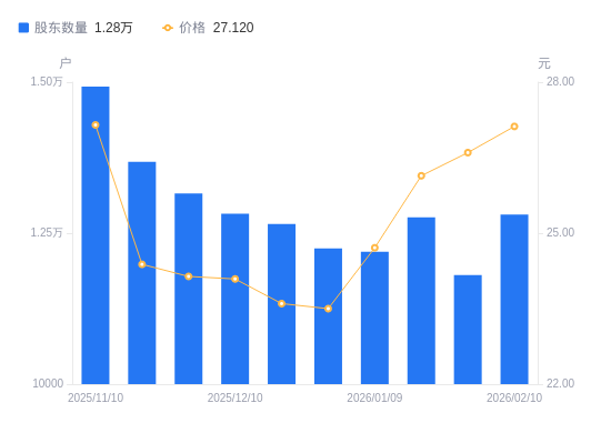 2月11日消息,数据显示,截至2026年2月10日,未来电器A股股东总户数为1.28万户,较上期(2026年1月30日)增加1003户,增幅8.50%。公司最新A股总股本为1.4亿股,其中流通A股4292.1万股,户均持有流通A股数量为3350.85股,较上期减少284.68股,降幅7.83%;户均持流通A股市值9.09万元,较上期减少5829.97元,降幅6.03%。