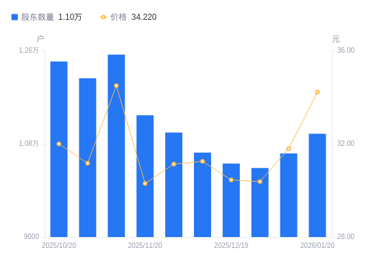 近一年(2025年1月31日至2026年1月20日),欣灵电气A股股东户数从9865户,增加至1.1万户,增幅11.45%,区间股价上涨48.65%。