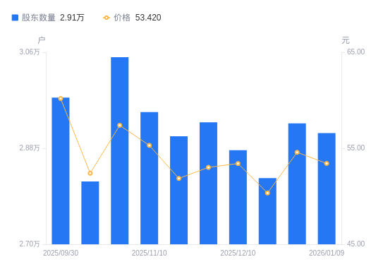 1月20日消息,数据显示,截至2026年1月9日,隆扬电子A股股东总户数为2.91万户,较上期(2025年12月31日)减少182户,降幅0.62%。公司最新A股总股本为2.83亿股,其中流通A股8456.9万股,户均持有流通A股数量为2907.85股,较上期增加18.08股,增幅0.63%;户均持流通A股市值15.53万元,较上期减少2386.08元,降幅1.51%。