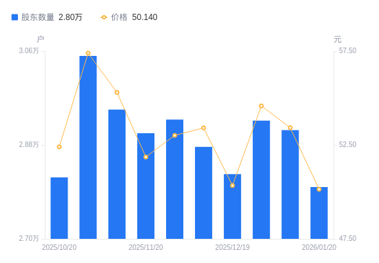 近一年(2025年1月20日至2026年1月20日),隆扬电子A股股东户数从1.99万户,增加至2.8万户,增幅40.89%,区间股价上涨219.93%。