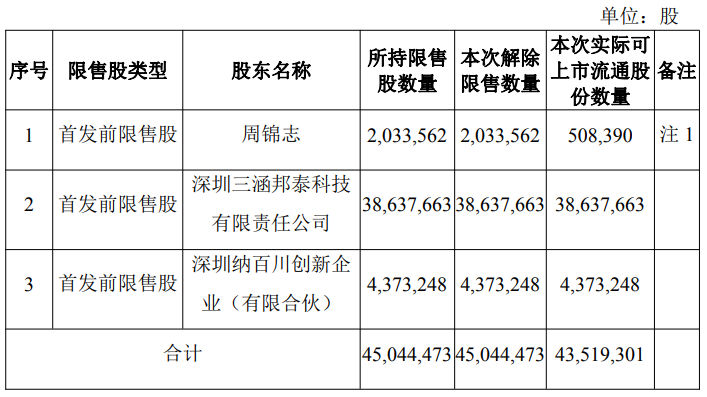 此次解除限售的股份为公司首次公开发行前已发行股份,解除限售的股东户数为3户,解除限售股份数量为4504万股,占公司总股本的47.4078%。该部分股份的限售期为自公司首次公开发行并上市之日起36个月,预计将于2025年12月1日上市流通。具体情况如下: