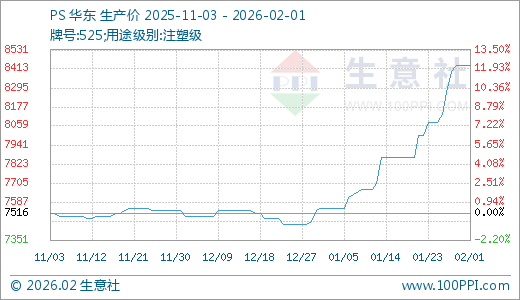 据生意社监测,PS02月01日最新价格8433.33元/吨,最近10天上涨5.42%,15天上涨7.20%,30天上涨11.70%。