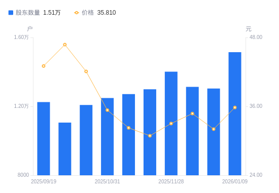 近一年(2025年3月31日至2026年1月9日),溯联股份A股股东户数从1.06万户,增加至1.51万户,增幅42.69%,区间股价上涨30.86%。