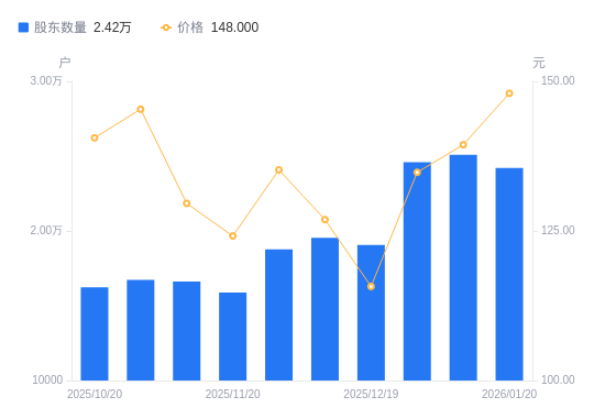 1月22日消息,数据显示,截至2026年1月9日,安培龙A股股东总户数为2.51万户,较上期(2025年12月31日)增加480户,增幅1.95%。公司最新A股总股本为9840.2万股,其中流通A股5874.99万股,户均持有流通A股数量为2342.22股,较上期减少45.7股,降幅1.91%;户均持流通A股市值32.65万元,较上期增加4614.35元,增幅1.43%。