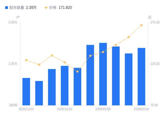近一年(2025年2月28日至2026年2月10日),安培龙A股股东户数从1.15万户,增加至2.39万户,增幅106.90%,区间股价上涨63.95%。