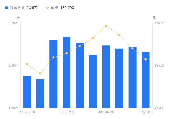 3月14日消息,数据显示,截至2026年3月10日,安培龙A股股东总户数为2.29万户,较上期(2026年2月27日)减少786户,降幅3.32%。公司最新A股总股本为9840.2万股,其中流通A股5874.99万股,户均持有流通A股数量为2569.54股,较上期增加85.4股,增幅3.44%;户均持流通A股市值33.97万元,较上期减少2.13万元,降幅5.89%。