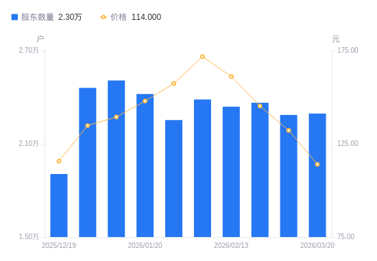 3月27日消息,数据显示,截至2026年3月20日,安培龙A股股东总户数为2.3万户,较上期(2026年3月10日)增加88户,增幅0.38%。公司最新A股总股本为9840.2万股,其中流通A股5874.99万股,户均持有流通A股数量为2559.69股,较上期减少9.85股,降幅0.38%;户均持流通A股市值29.18万元,较上期减少4.79万元,降幅14.10%。