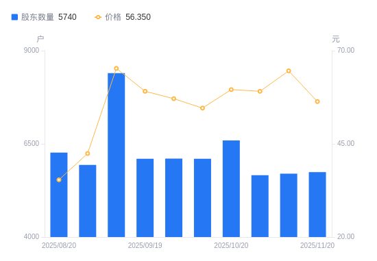 近一年(2024年11月20日至2025年11月20日),开创电气A股股东户数从8660户,减低至5740户,降幅33.72%,区间股价上涨161.85%。