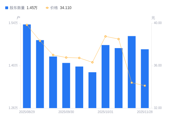 近一年(2024年11月29日至2025年11月28日),金凯生科A股股东户数从1.14万户,增加至1.45万户,增幅27.56%,区间股价上涨21.17%。