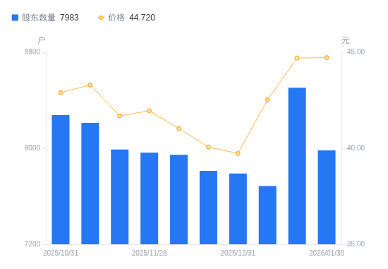 近一年(2025年3月31日至2026年1月30日),万邦医药A股股东户数从9256户,减低至7983户,降幅13.75%,区间股价上涨7.76%。