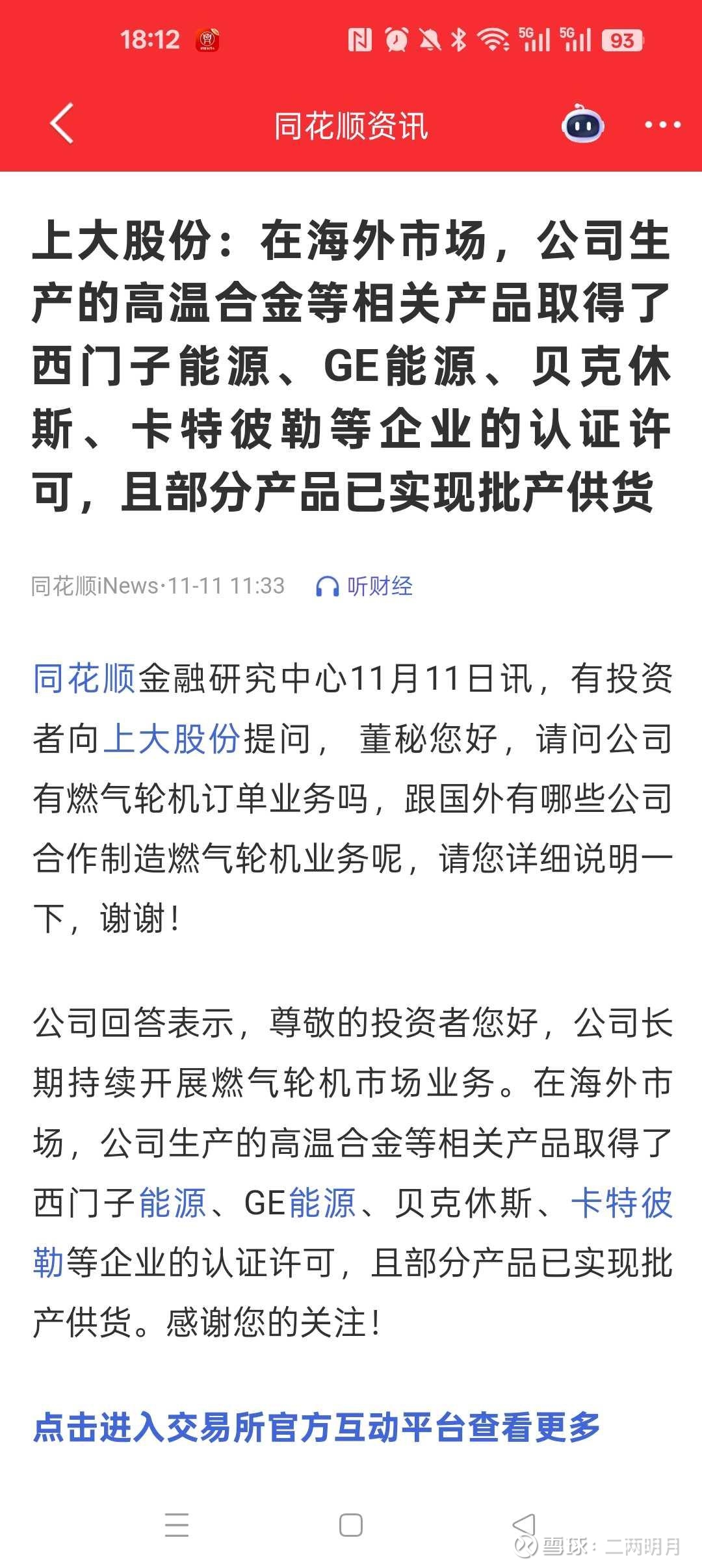上大股份唯一覆盖四大燃气轮机的公司,公司长期持续开展燃气轮机市场业务。在海外市场,公司生产的高温合金等相关产品取得了西门子能源、 GE 能源、贝克休斯、卡特彼勒等企业的认证许可,且部分产品已实现批产供货。