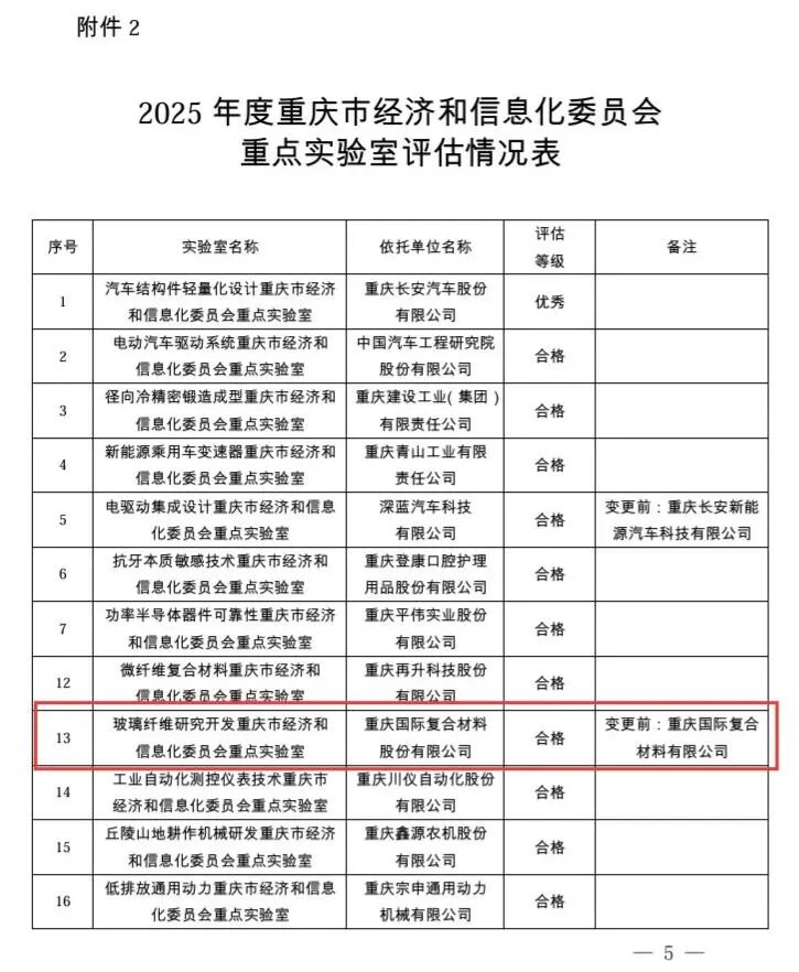 近日,重庆市经济和信息化委员会发布了《关于公布2025年度重庆市经济和信息化委员会重点实验室认定和评估结果的通知》,云天化(600096)国际复材(301526)承建的“玻璃纤维研究开发重庆市经济和信息化委员会重点实验室”顺利通过周期性评估。