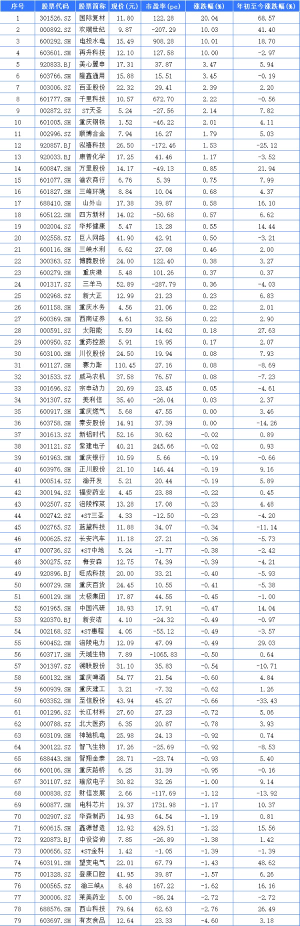 下跌渝股43家,有友食品、西山科技和莱美药业分别以-4.60%、-2.76%和-2.72%列涨幅最后三位。