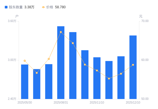 近一年(2024年12月20日至2025年12月10日),星宸科技A股股东户数从2.62万户,增加至3.38万户,增幅29.13%,区间股价下跌16.34%。