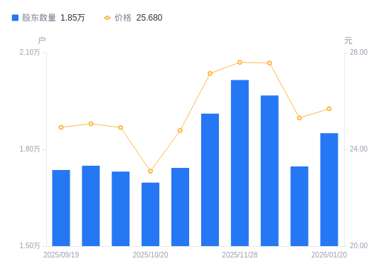 近一年(2025年2月20日至2026年1月20日),中仑新材A股股东户数从1.94万户,减低至1.85万户,降幅4.43%,区间股价上涨8.49%。