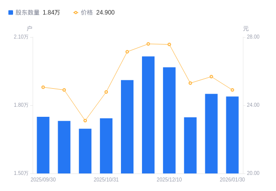 2月2日消息,数据显示,截至2026年1月30日,中仑新材A股股东总户数为1.84万户,较上期(2026年1月20日)减少116户,降幅0.63%。公司最新A股总股本为4亿股,其中流通A股1.28亿股,户均持有流通A股数量为6962.36股,较上期增加43.65股,增幅0.63%;户均持流通A股市值17.34万元,较上期减少4309.68元,降幅2.43%。