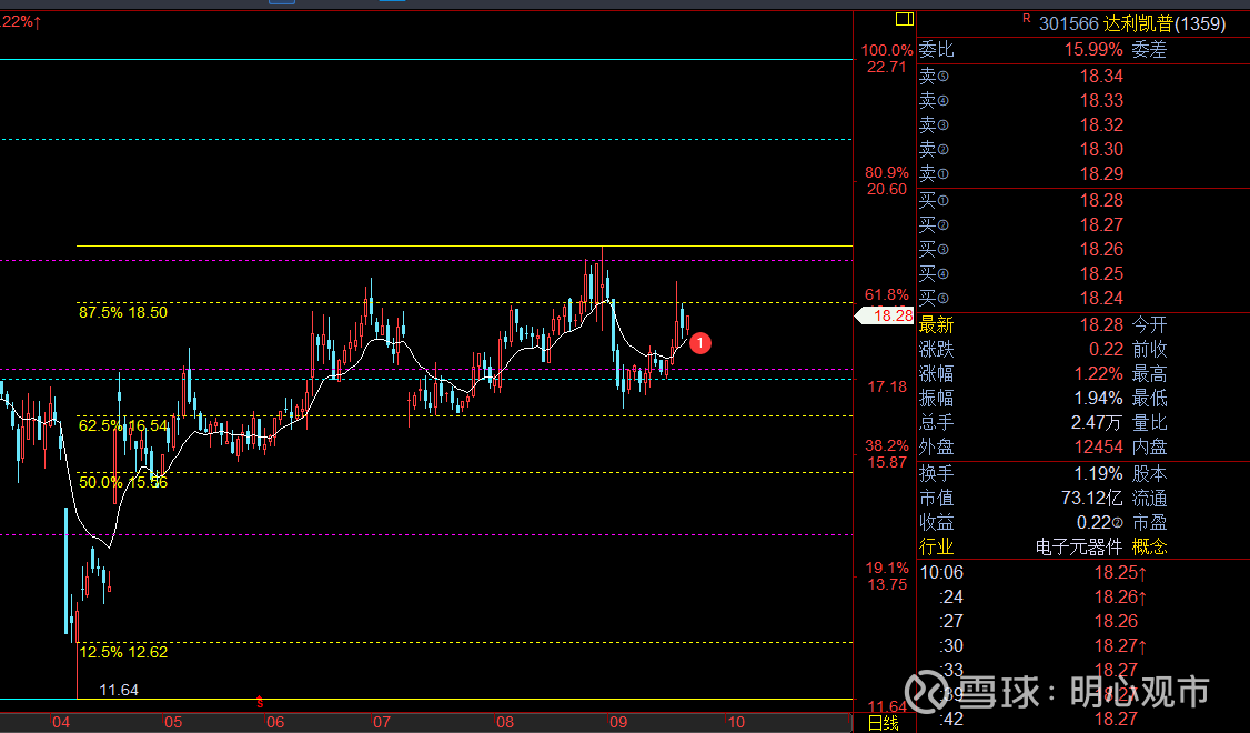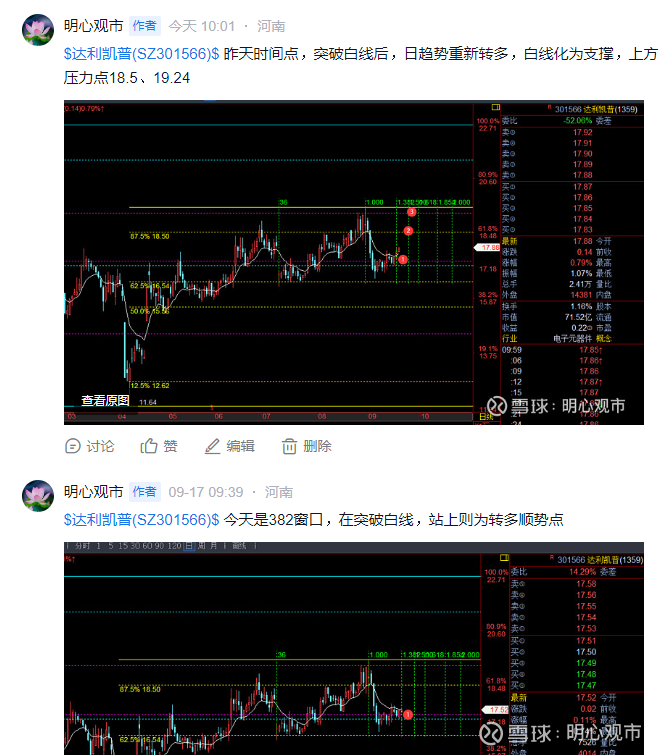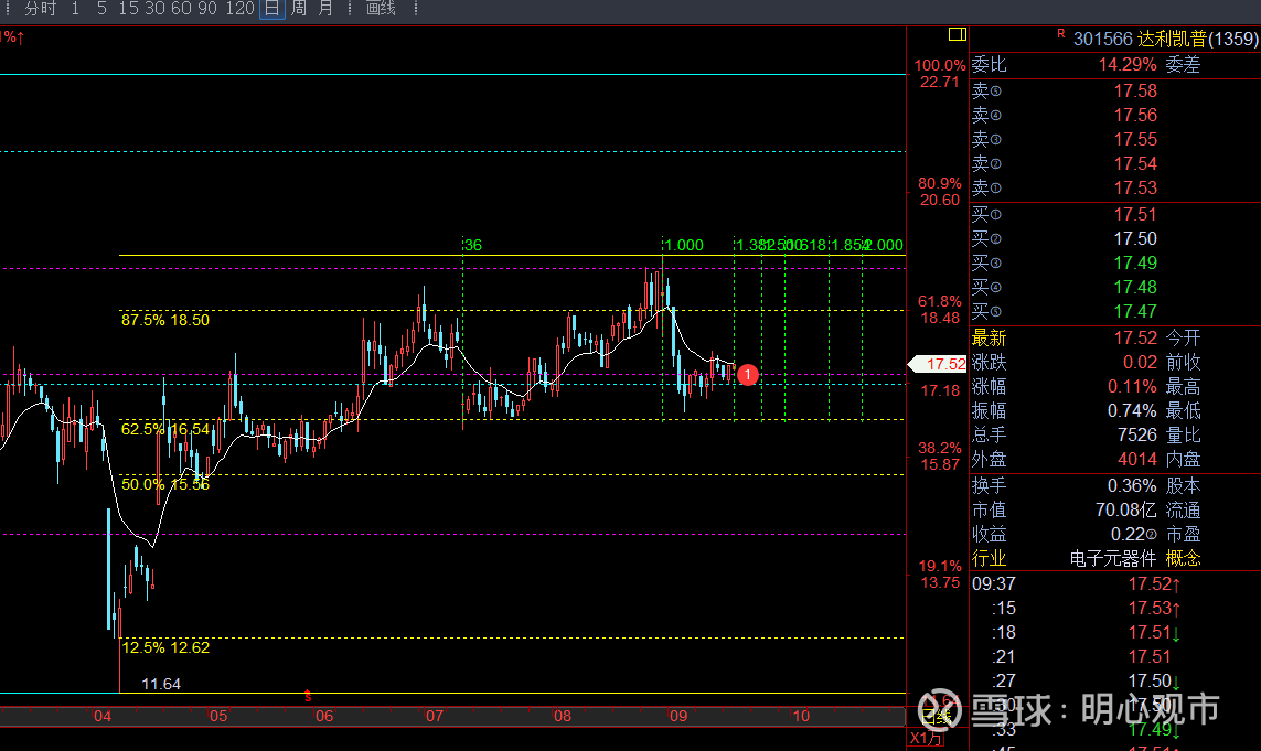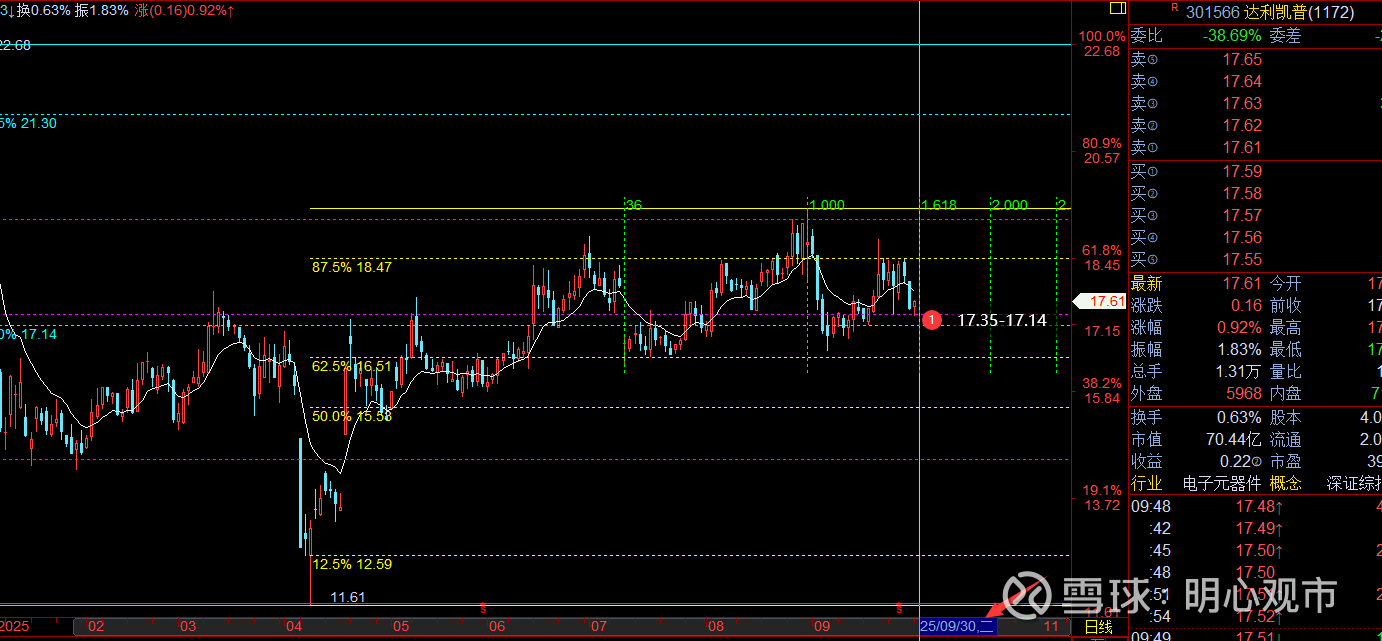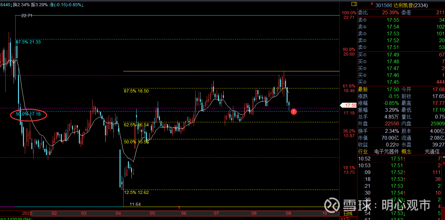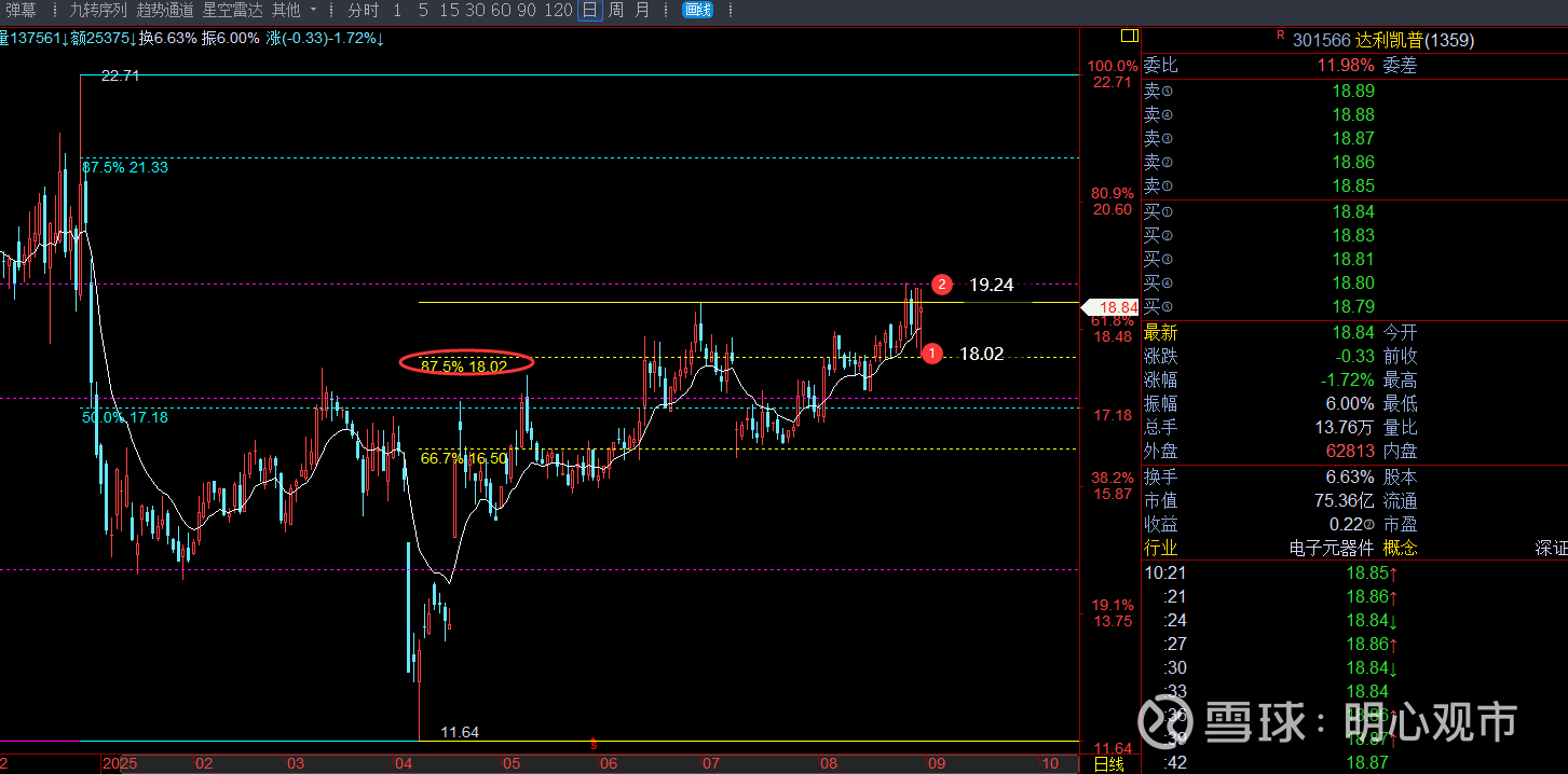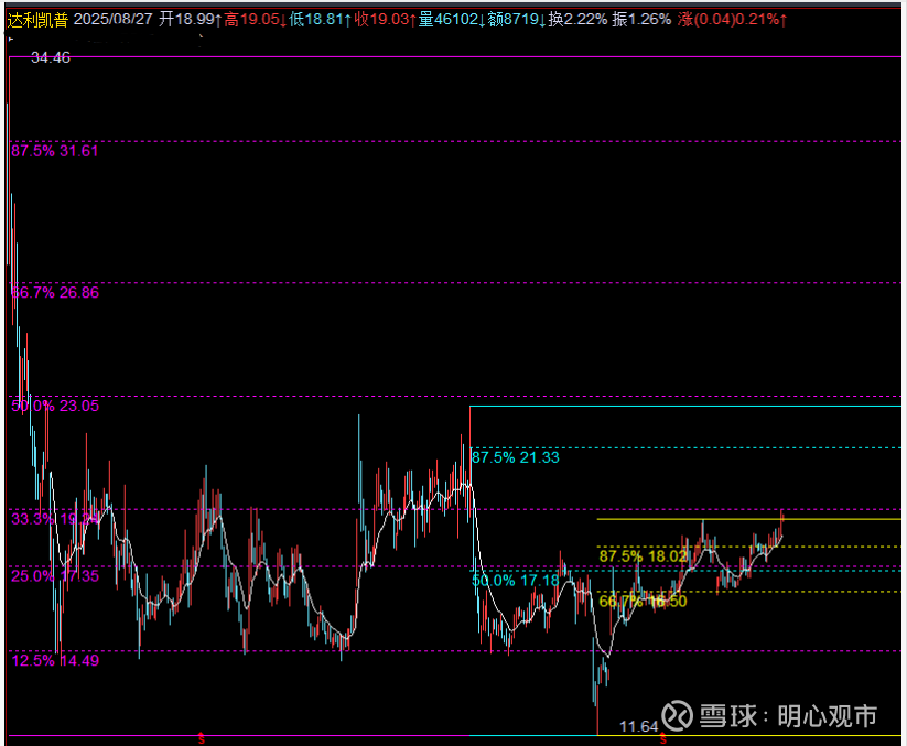 达利凯普,按照图灵趋势时空法分析:趋势层面,白色多空线17.72,红色生命线17.23,短线波段共振看多;价格上,叠加百分比显示,当前支撑17.7-17.18,短压19.24,波段有去21.3、23.5预期;时间上,8月15日是短期窗口;风孔参考16.5。