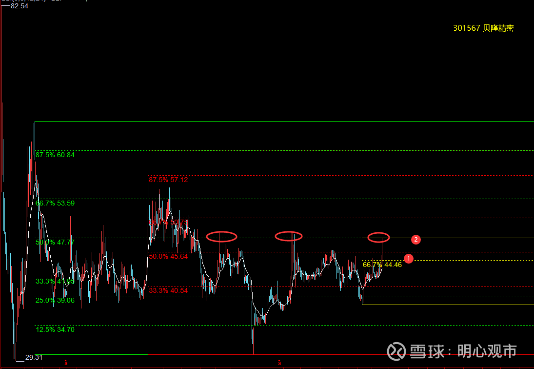 47.77这个绿线的半分位目前是第三次冲击,受压回落,但不破趋势就还有继续上攻该位置并突破的机会;当前支撑44.46、43.25,反压47.77,能突破47.77,则波段内趋势进一步转多,再顺势50.7、53.5
