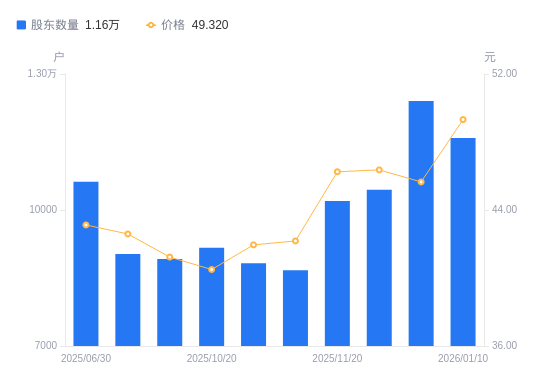 近一年(2025年1月27日至2026年1月10日),贝隆精密A股股东户数从1.01万户,增加至1.16万户,增幅14.39%,区间股价上涨22.41%。