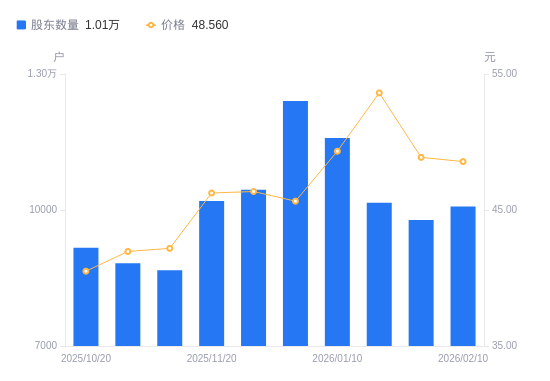 近一年(2025年3月10日至2026年2月10日),贝隆精密A股股东户数从9288户,增加至1.01万户,增幅8.51%,区间股价上涨11.27%。