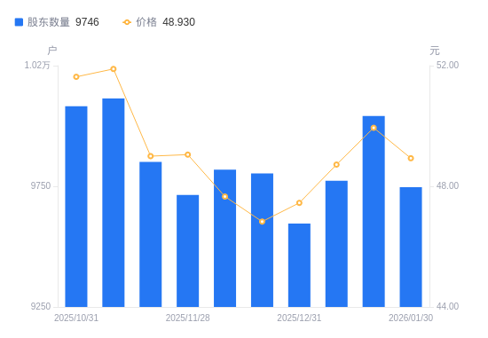 2月2日消息,数据显示,截至2026年1月30日,黄山谷捷A股股东总户数为9746户,较上期(2026年1月20日)减少295户,降幅2.94%。公司最新A股总股本为8000万股,其中流通A股4887.8万股,户均持有流通A股数量为5015.19股,较上期增加147.34股,增幅3.03%;户均持流通A股市值24.54万元,较上期增加2293.02元,增幅0.94%。