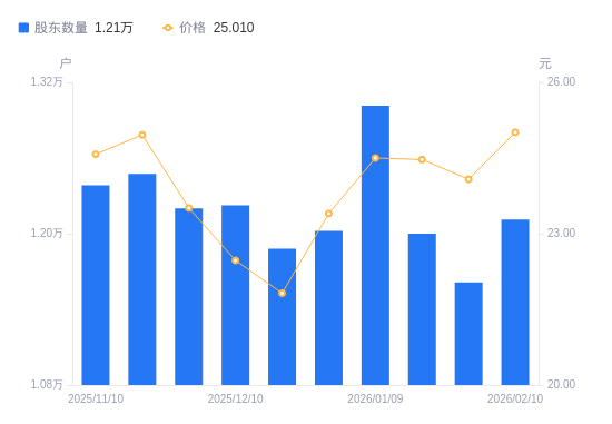近一年(2025年2月10日至2026年2月10日),中瑞股份A股股东户数从1.18万户,增加至1.21万户,增幅2.27%,区间股价上涨8.72%。