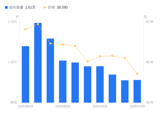 近一年(2024年11月29日至2025年11月28日),肯特股份A股股东户数从9535户,增加至1.01万户,增幅5.53%,区间股价上涨10.23%。