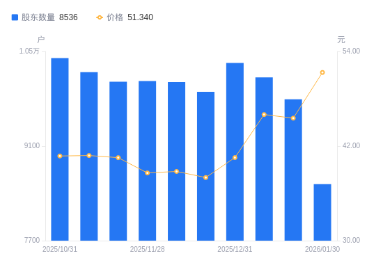 近一年(2025年2月10日至2026年1月30日),肯特股份A股股东户数从1.01万户,减低至8536户,降幅15.84%,区间股价上涨30.87%。