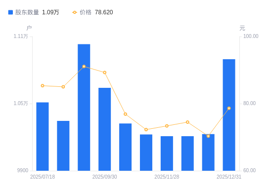 近一年(2024年12月31日至2025年12月31日),瑞迪智驱A股股东户数从1.01万户,增加至1.09万户,增幅7.58%,区间股价上涨6.84%。