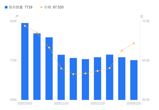 1月21日消息,数据显示,截至2026年1月20日,博科测试A股股东总户数为7719户,较上期(2026年1月9日)减少103户,降幅1.32%。公司最新A股总股本为5889.72万股,其中流通A股1754.77万股,户均持有流通A股数量为2273.32股,较上期增加29.93股,增幅1.33%;户均持流通A股市值15.35万元,较上期增加5318.98元,增幅3.59%。